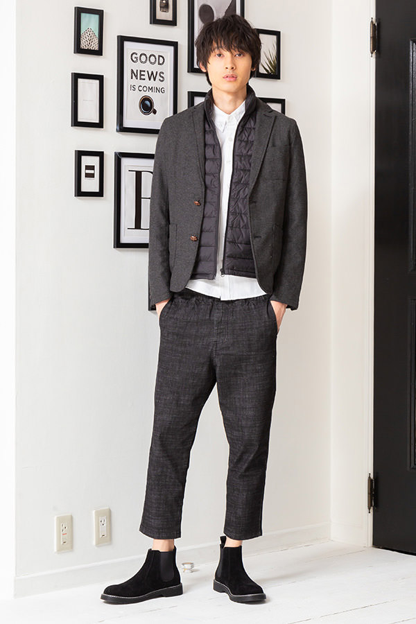 こちらはブラック、チャコールと色味が近いアイテムでまとめた同系色コーデですが、