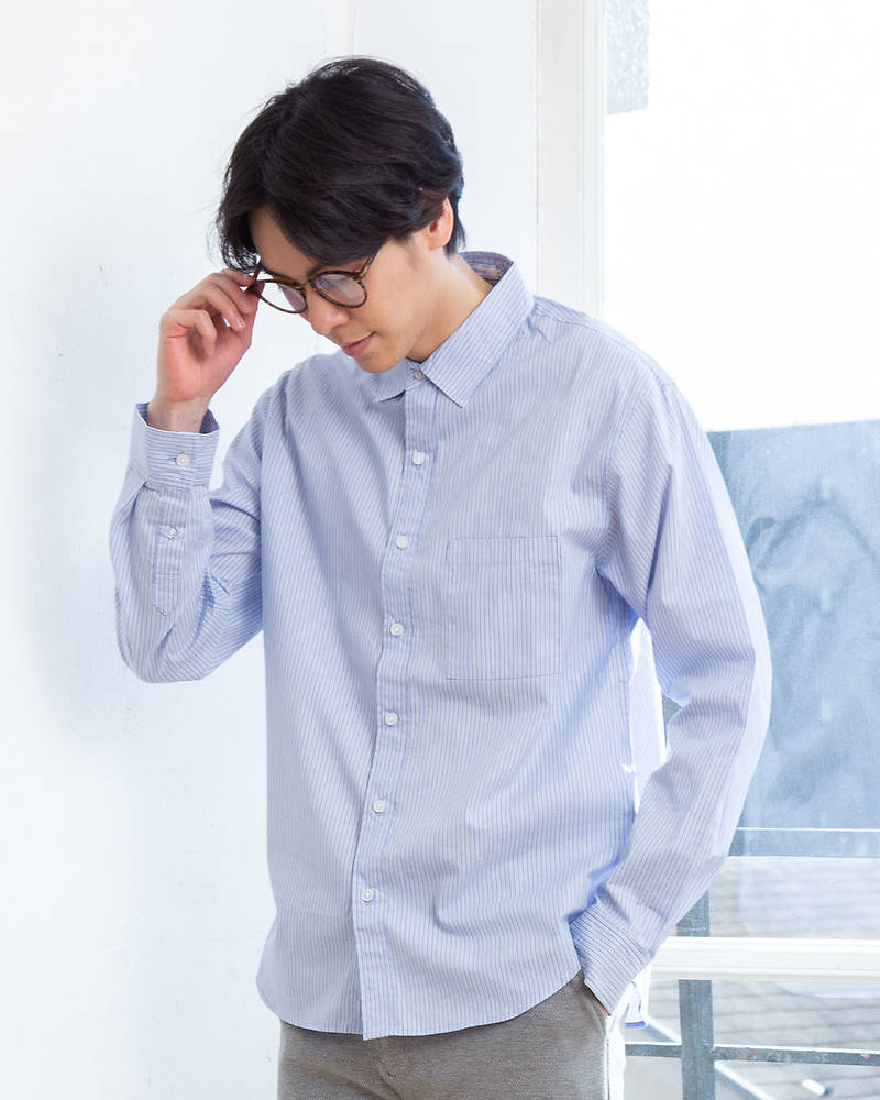 明るめのサックスに白の混じったストライプが入った、爽やか感漂うシャツ。