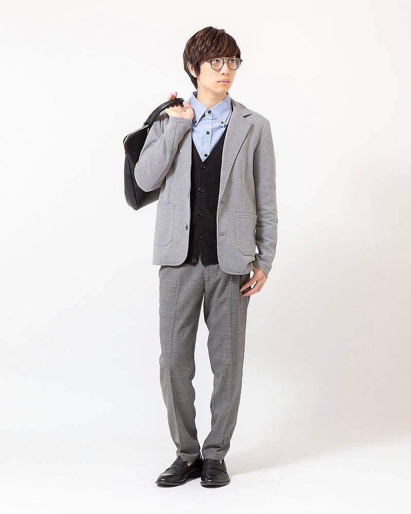 テーラードジャケット×カーディガン×長袖シャツ×半袖Tシャツ×パンツ