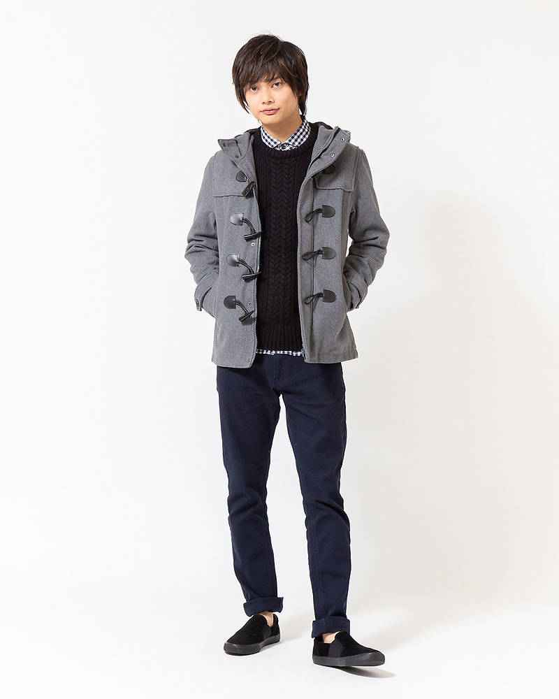 ダッフルコート×ニット×長袖シャツ×半袖Tシャツ×パンツ