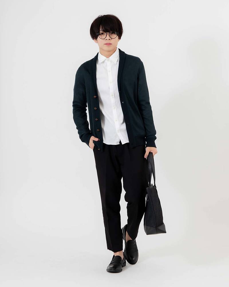 カーディガンをラフに着てもシャツのおかげで崩れすぎないコーディネートになっていますね。