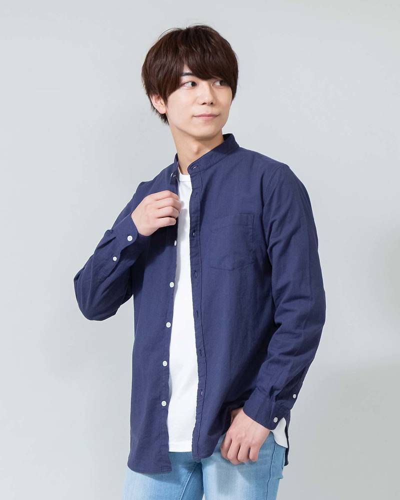 3位綿麻ストレッチバンドカラー長袖シャツ