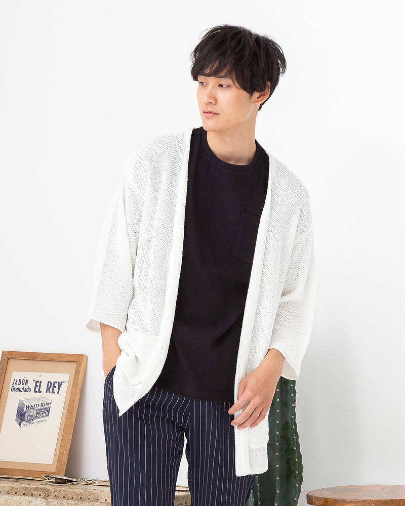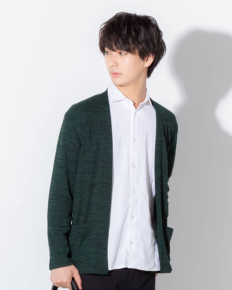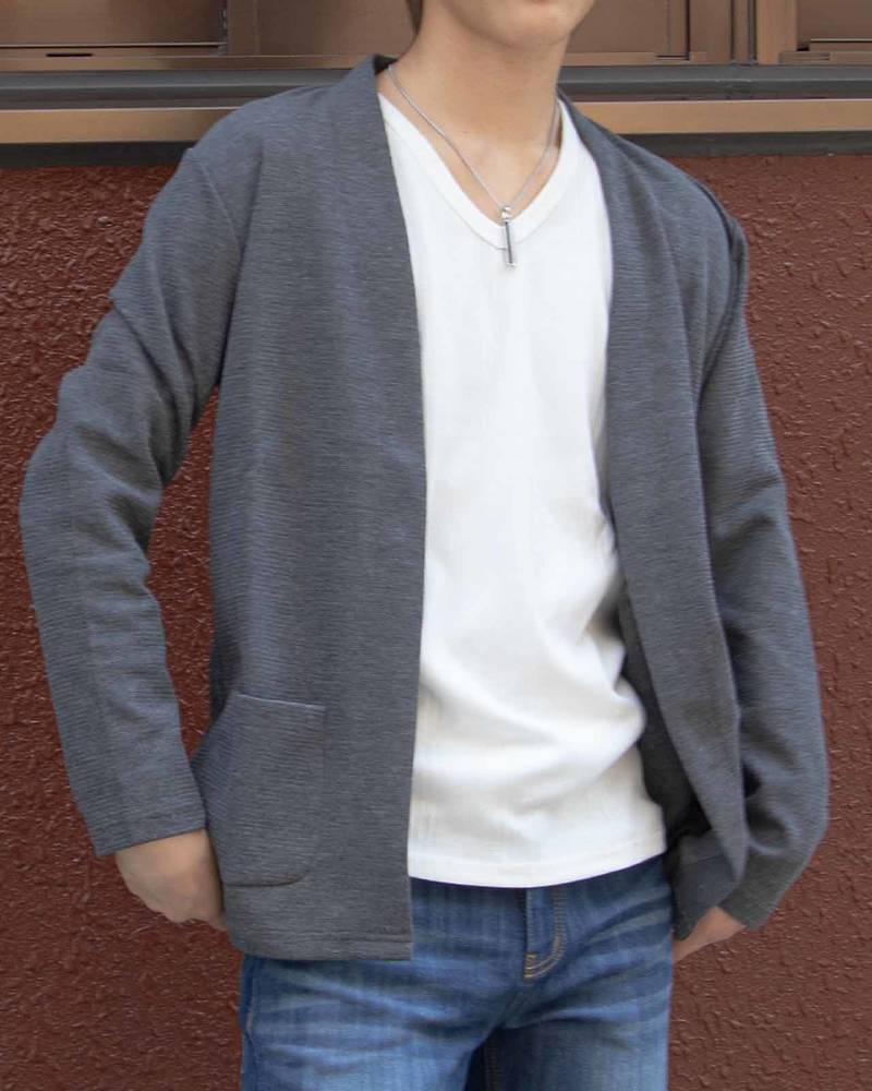 ボタンがなく前を閉じずに羽織るだけになるタイプはリラックスした印象を与えます。