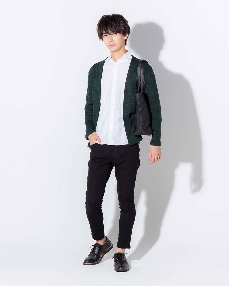 ベーシックな色味のカーディガンを使っている所に少しの違いを出せるグリーンカーディガン。
