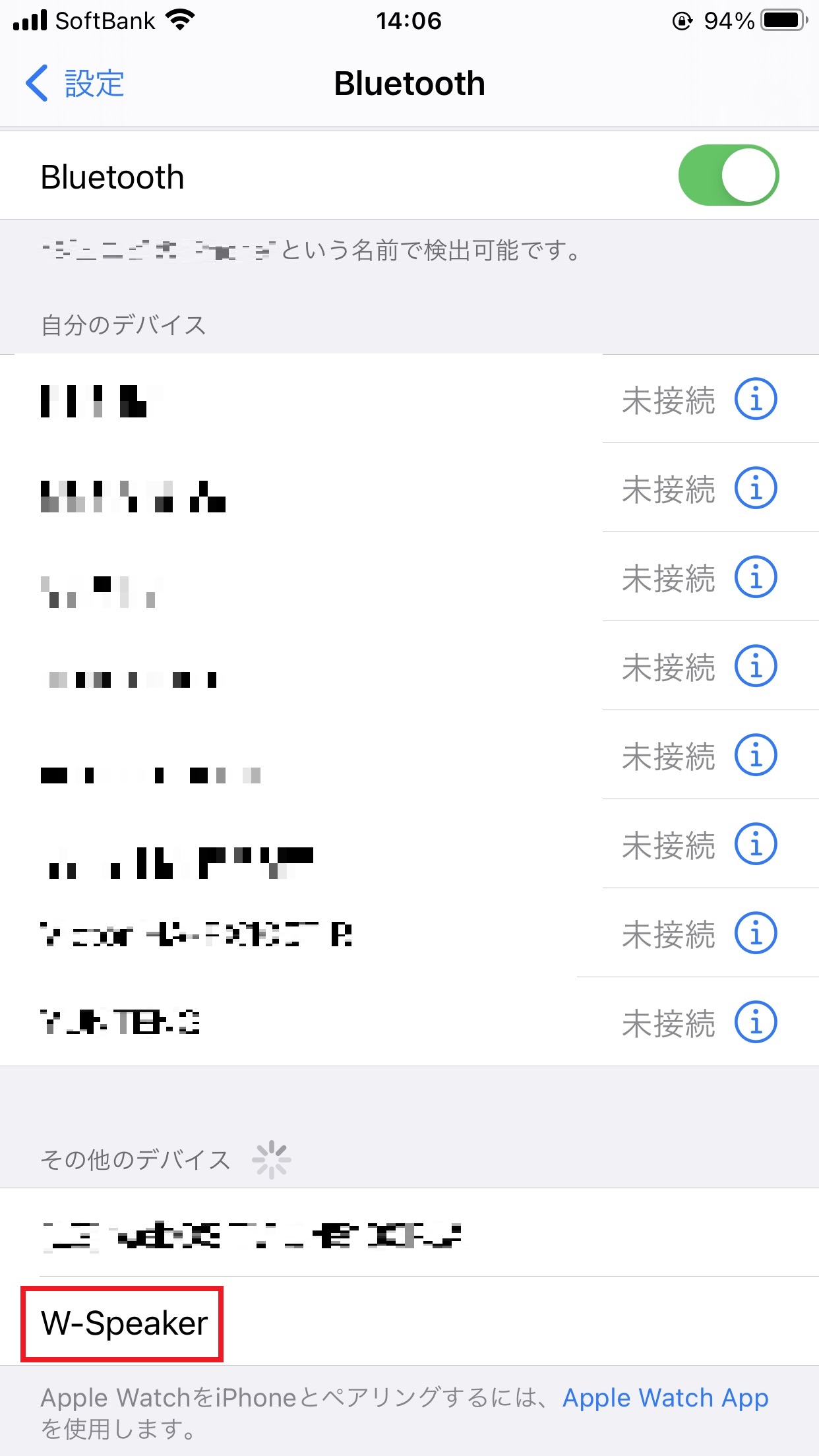 その後、スマホの設定からBluetoothの接続画面にいき、「W-Speaker」と表示されている項目をタッチし接続します。