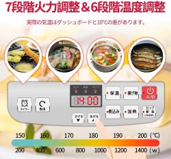 | 付加機能 | 鍋検知機能 鍋なしOFF機能 小物発熱防止機能 切り忘れ防止機能 異常温度上昇防止機能 短絡保護機能 異常電圧警告機能 雷サージ保護機能 マグネット式電源コード 揚げ物温度調整機能 タイマー機能 |