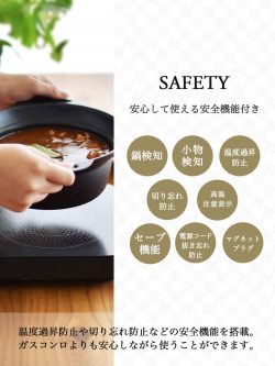 | 付加機能 | 電源自動OFF機能 切り忘れ防止機能 空だき防止機能 異常温度上昇防止機能 鍋なし自動OFF機能 誤作動防止機能 小物発熱防止機能 |