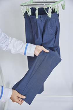 ウールの場合は脚の部分をパンツの両側から手ではさんで、上から下へ軽く滑らせるようにしてしわを伸ばしましょう。