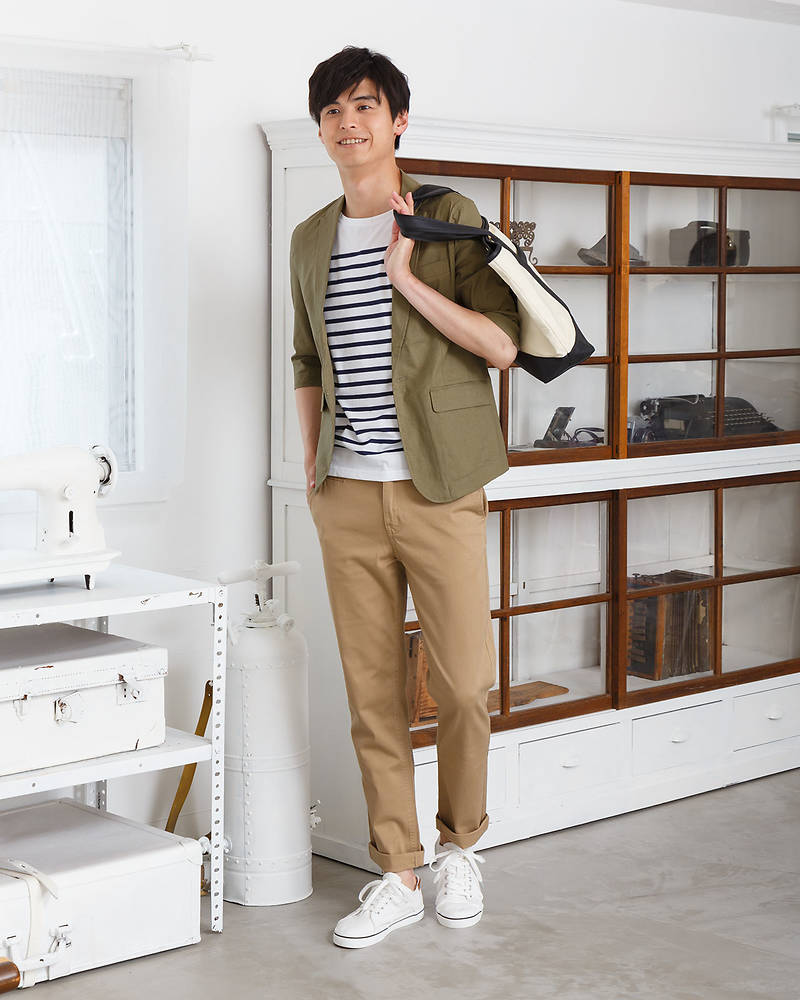 これならかちっとしたテーラードジャケットでありながら、カーキの抜け感が絶妙。