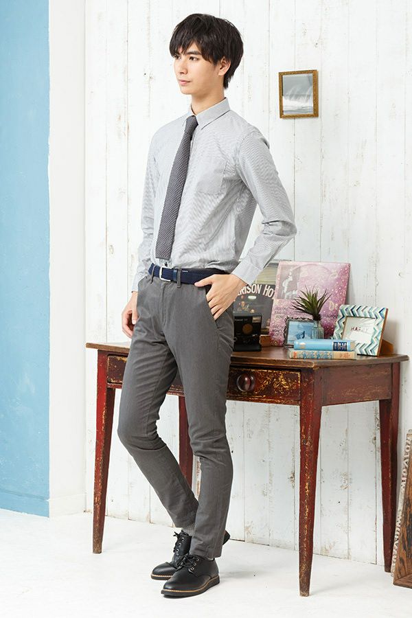 たとえば、ストライプ柄のシャツにニットタイを締め、グレーのストレッチパンツを合せたコーデ。