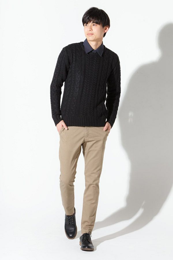ケーブルニット×長袖シャツ×半袖Tシャツ×ストレッチパンツ(4点セット)