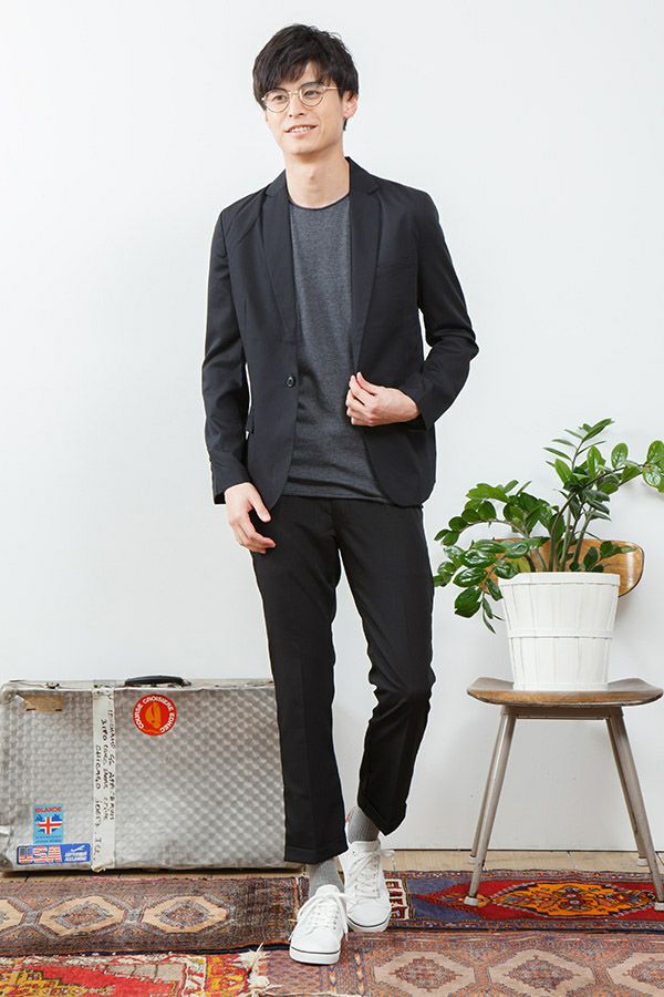 また、黒テーラードジャケットに黒のアンクルパンツを合せると、こうなります。
