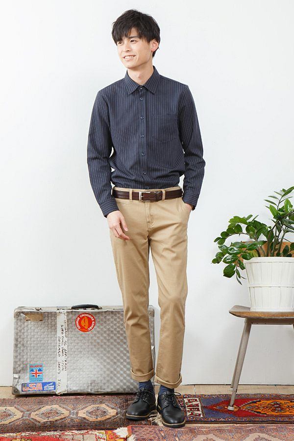 インナーはネイビーのストライプ柄の長袖シャツ、ボトムスはベージュのストレッチパンツ。