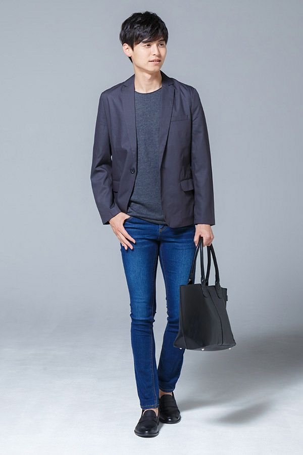 デニムにTシャツというラフなスタイルも、テーラードジャケットを羽織ればたちまち上品にランクアップ。