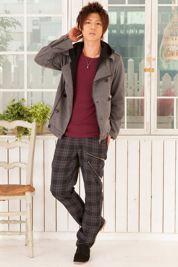 コート×パーカー×パンツ
