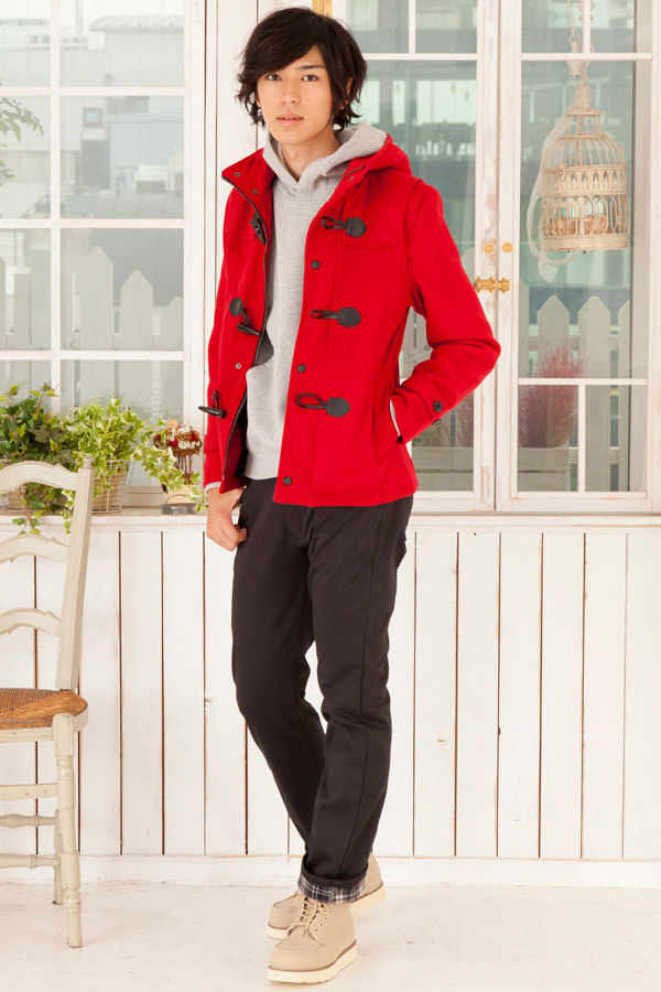しかも赤色をしつこくなく着れている全体的な色使いもすごくオシャレ!中にパーカーというのもツボです!