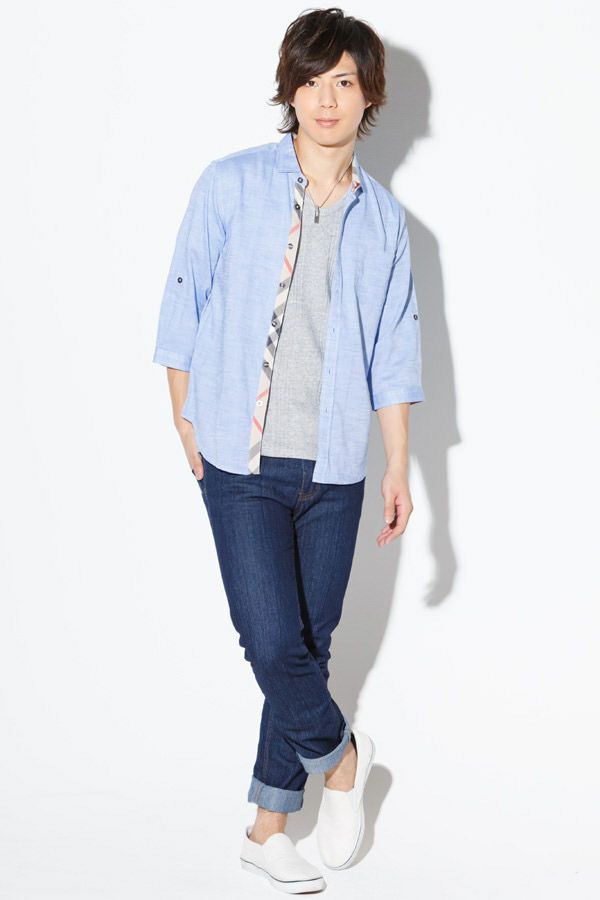 七分袖シャツ×半袖Tシャツ×デニムパンツ(3点セット)