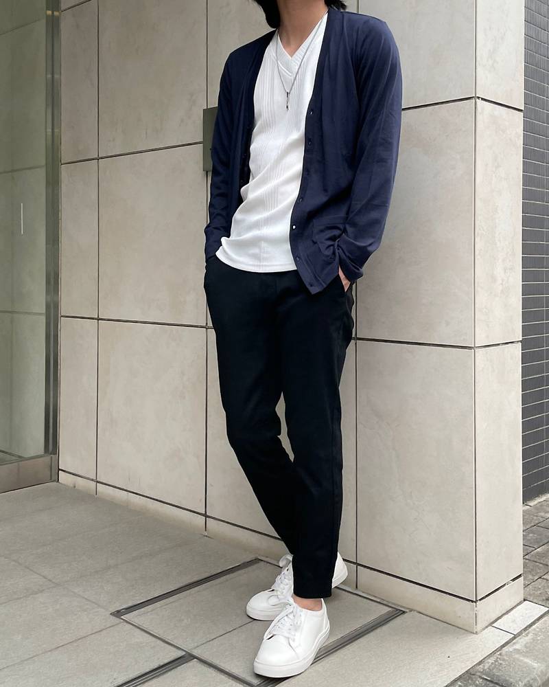全体的にはカジュアルな感じですが、紺のカーディガンと黒のインナーが引き締まった印象を与えていて、スッキリと清潔感のあるコーディネートだと思いました。