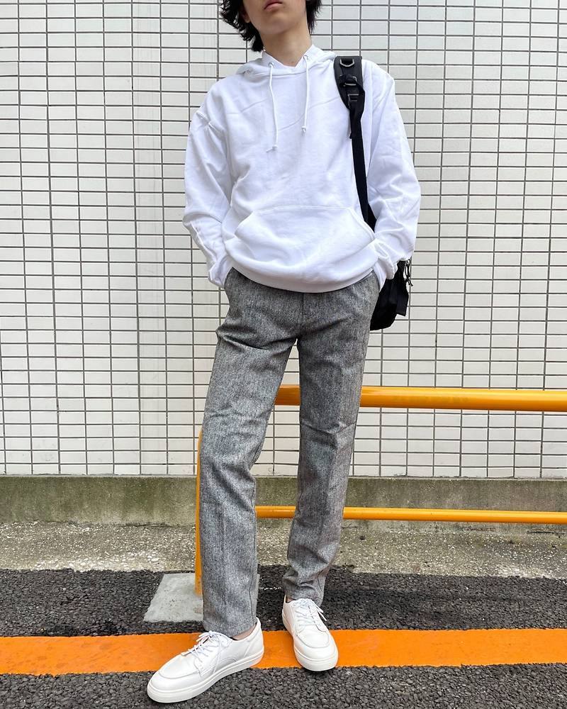 足元は、清潔感のある白スニーカーでカジュアルダウンすることで、親しみやすさもプラスされます。