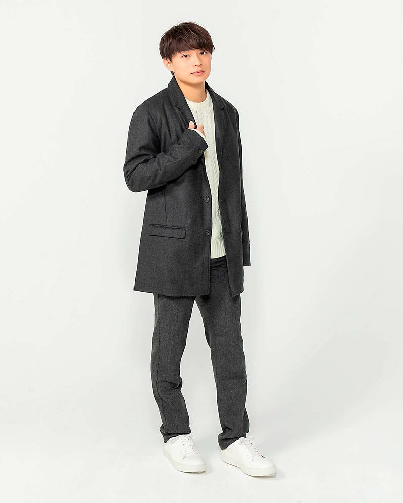 チャコールカラーで、暖かみあるカラーと生地感が特徴の1着。