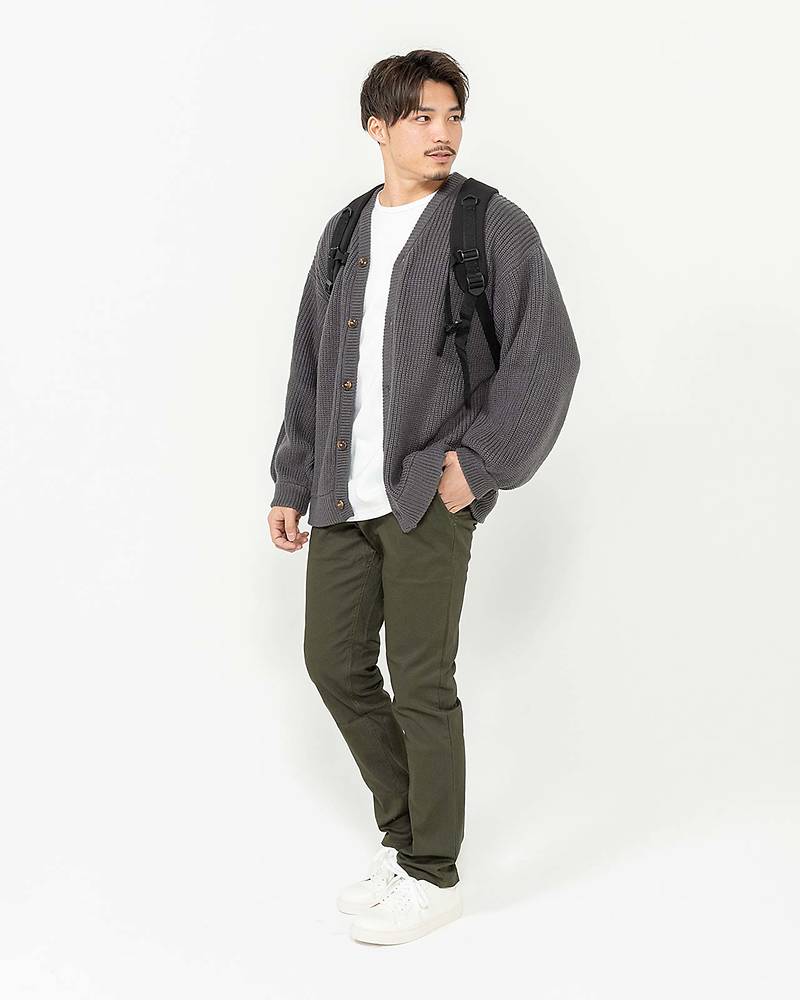 カーディガンの柔らかい印象も残しつつ、ダークトーンでかっこよさもあって、