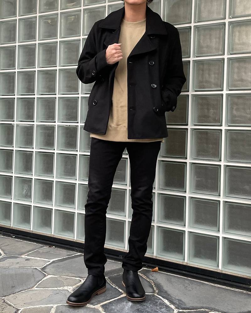 同じ裏起毛のBIGシルエットトレーナーですが、ブーツやスキニーパンツ、Pコートを組み合わせることで、王道大人カジュアルに仕上がっています。