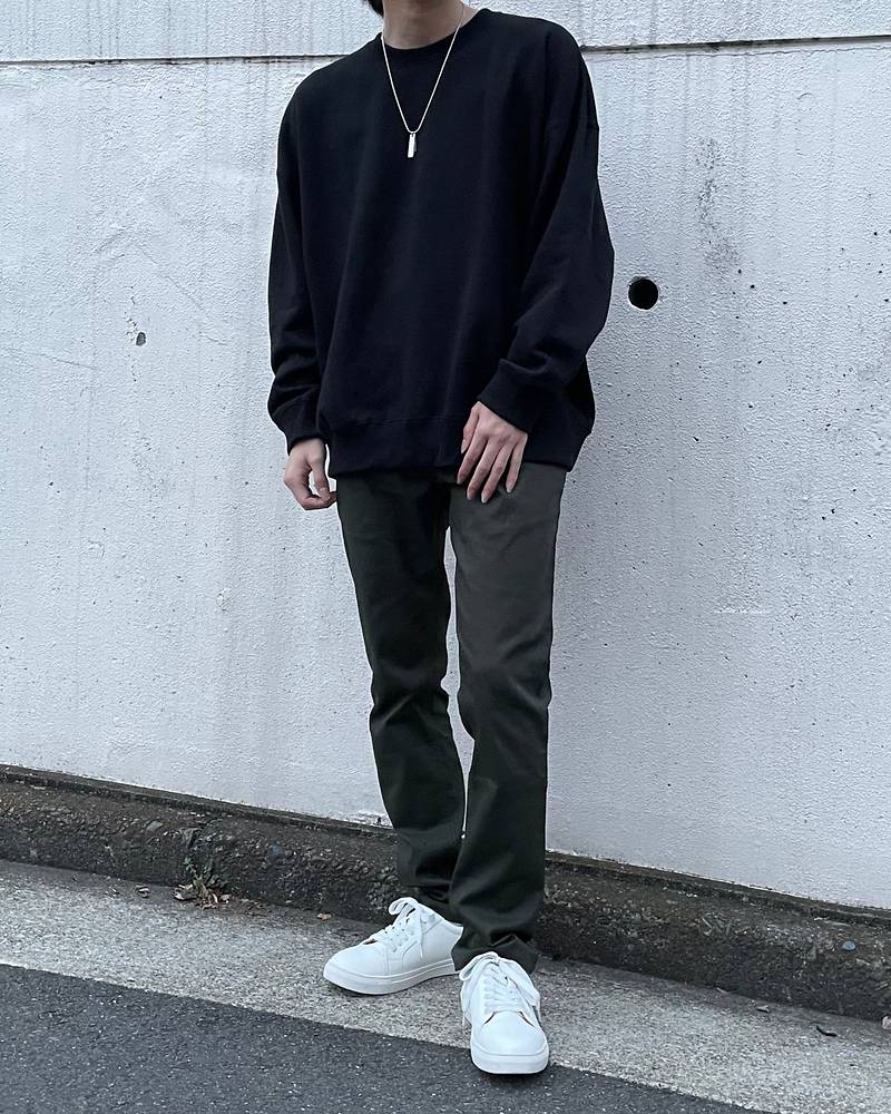 大きめサイズのスウェットにツイルチノパンのシンプルコーデ
