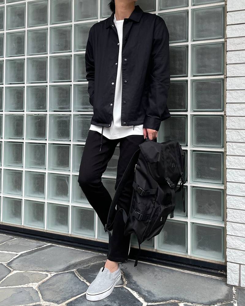 黒を貴重としたクールな印象に仕上がってますが、丈長のTシャツとスリッポンシューズでマイルドなバランスに仕立てていますね。