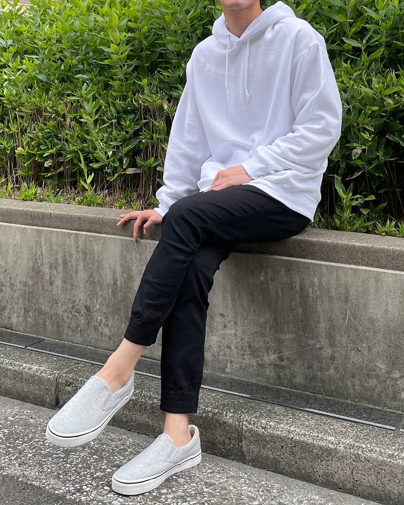 ゆるシルエットのパーカーとジョガータイプの黒チノパンでトレンドコーデ完成