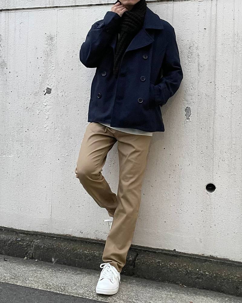 トップスに黒いPコートと黒いマフラー、ボトムスにベージュのチノパンと白いシューズという王道の組み合わせです!