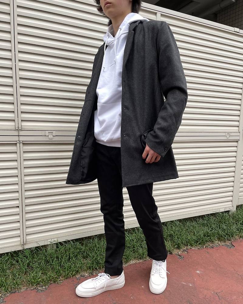 インナーに白Tシャツを合わせることで、コートのボタンを開けたときに印象チェンジの効果もあります。
