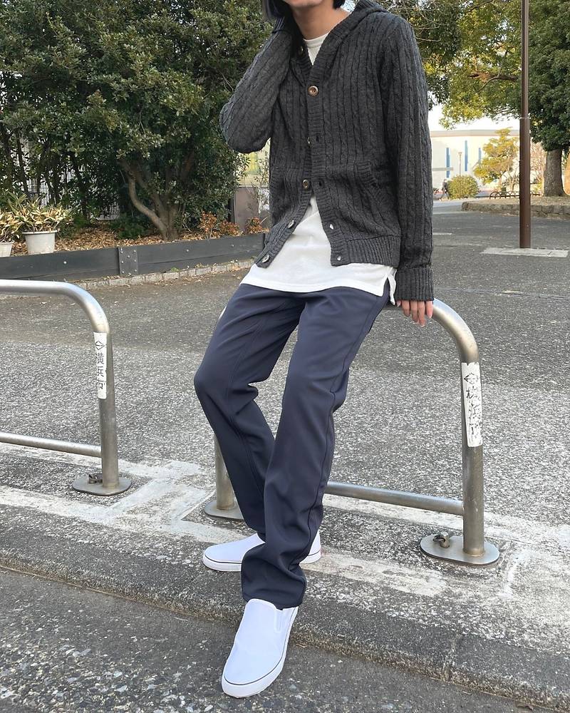 細身のチノパンを選ぶときは、トップスは少し「やりすぎかも」と思うくらいのボリュームが丁度いいかもしれません。