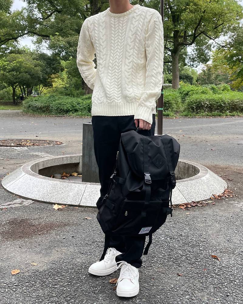 シンプルなモノトーンコーデですが、ゆったりとした白いケーブルニットが親しみやすい印象を与えてくれていますね。