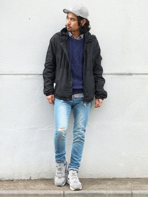 ダメージジーンズやマウンテンパーカーで男っぽいラフな着こなしですが、インナーに重ね着したギンガムチェックシャツとケーブルニットでしっかりとまとまっています。
