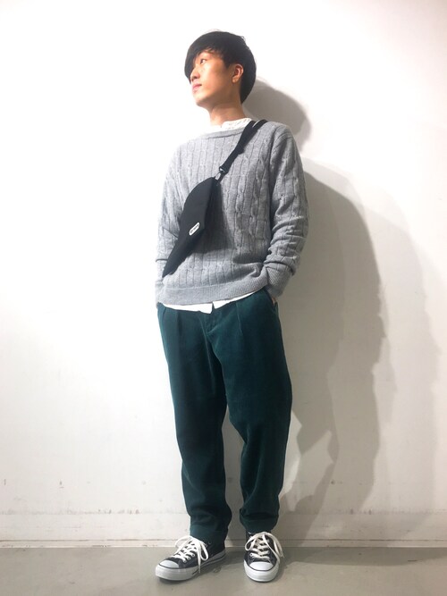どんなときでも使いやすいグレーのケーブルニットにトレンドのグリーンを取り入れたコーデです。