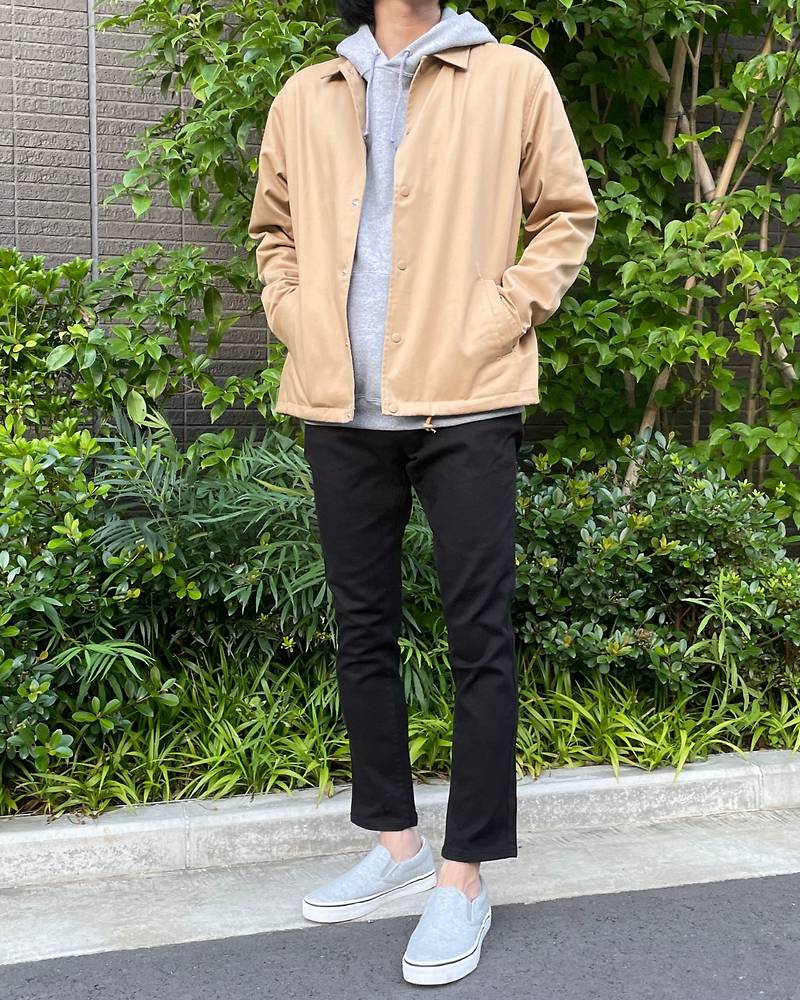 同じパーカー×コーチジャケットでも、黒にするだけで一気に大人っぽい印象になります。
