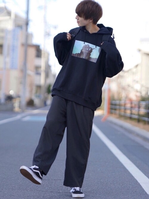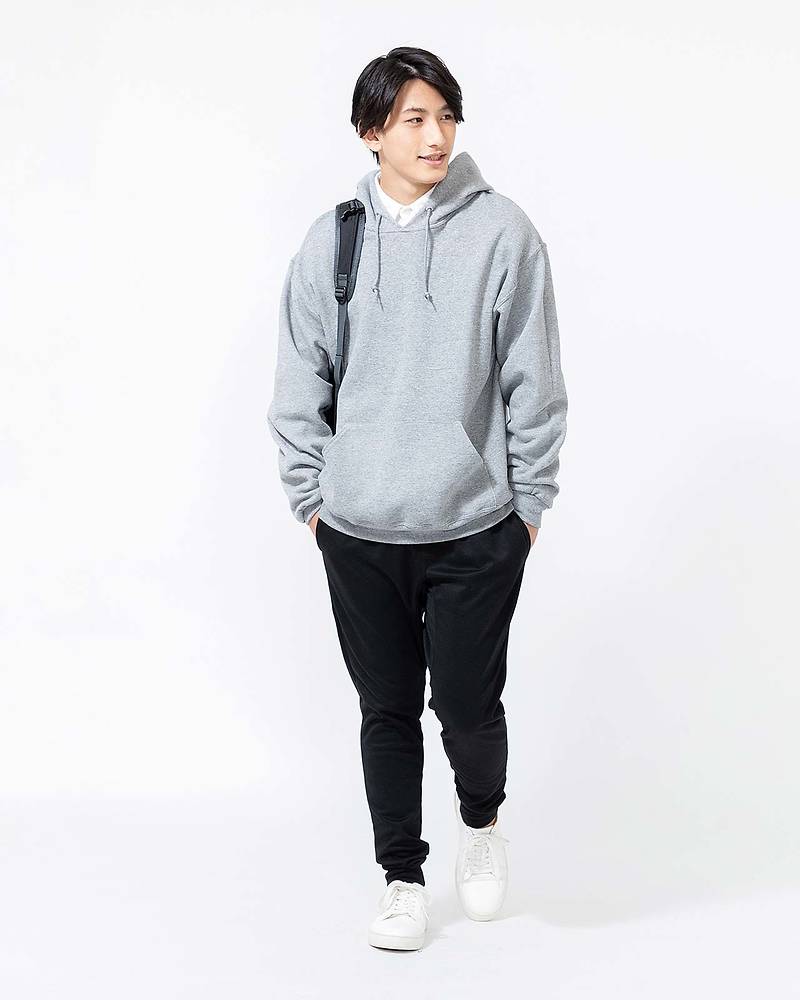 バックパックやシューズのほか、ボトムスの素材など変化もつけやすいので、パーカーコーデが苦手な人はこういったシンプルなものからトライしていきましょう。