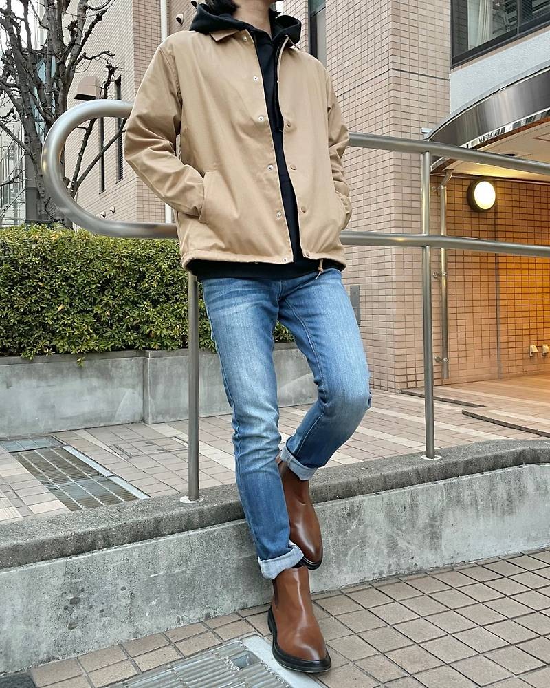 肌寒い日が続く時期は、チェスターコートと組み合わせるのもおすすめです。