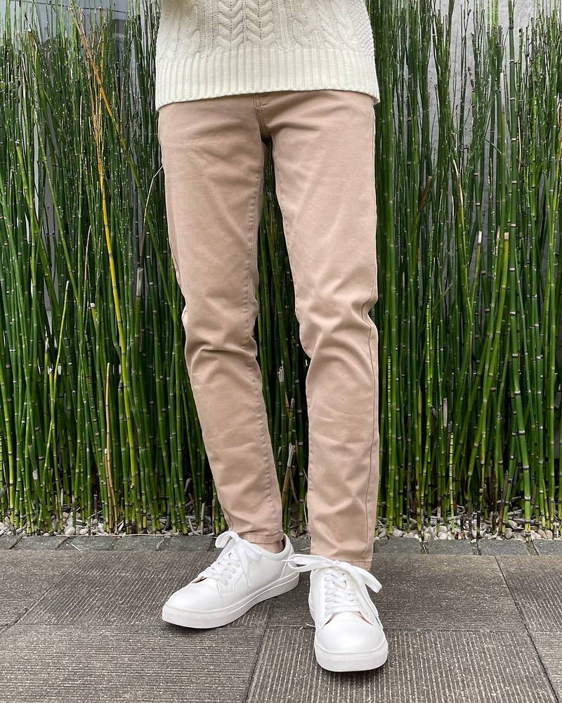 ストレートでタイトなシルエットが上品なベージュチノパンです。