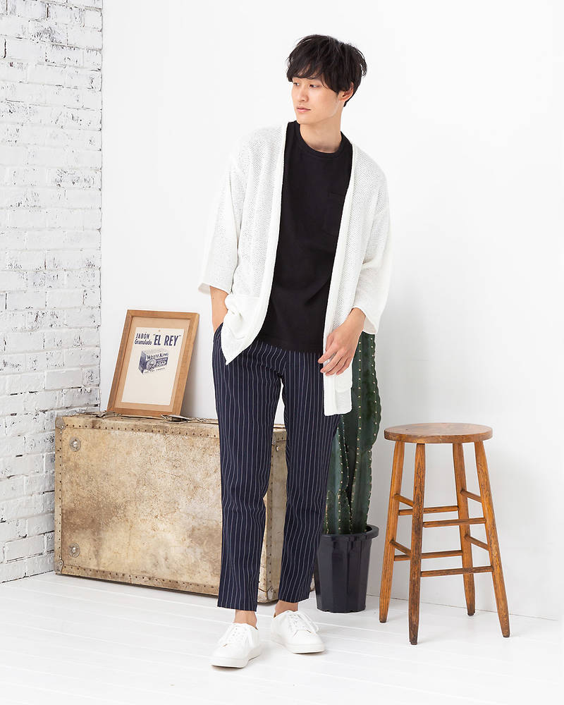 七分袖ニットカーディガン×半袖Tシャツ×パンツ