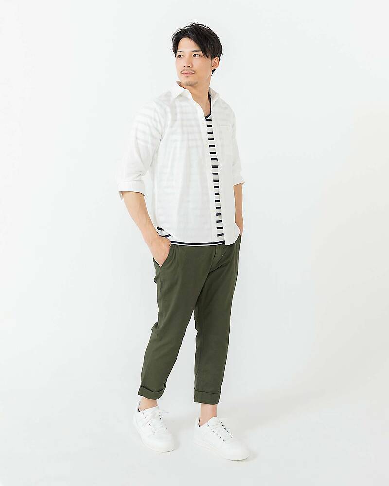 七分袖シャツ&スニーカーのコーディネートでも、素材感や、ちょっとしたデザインがあるアイテムの組み合わせでお洒落な雰囲気を演出できます。