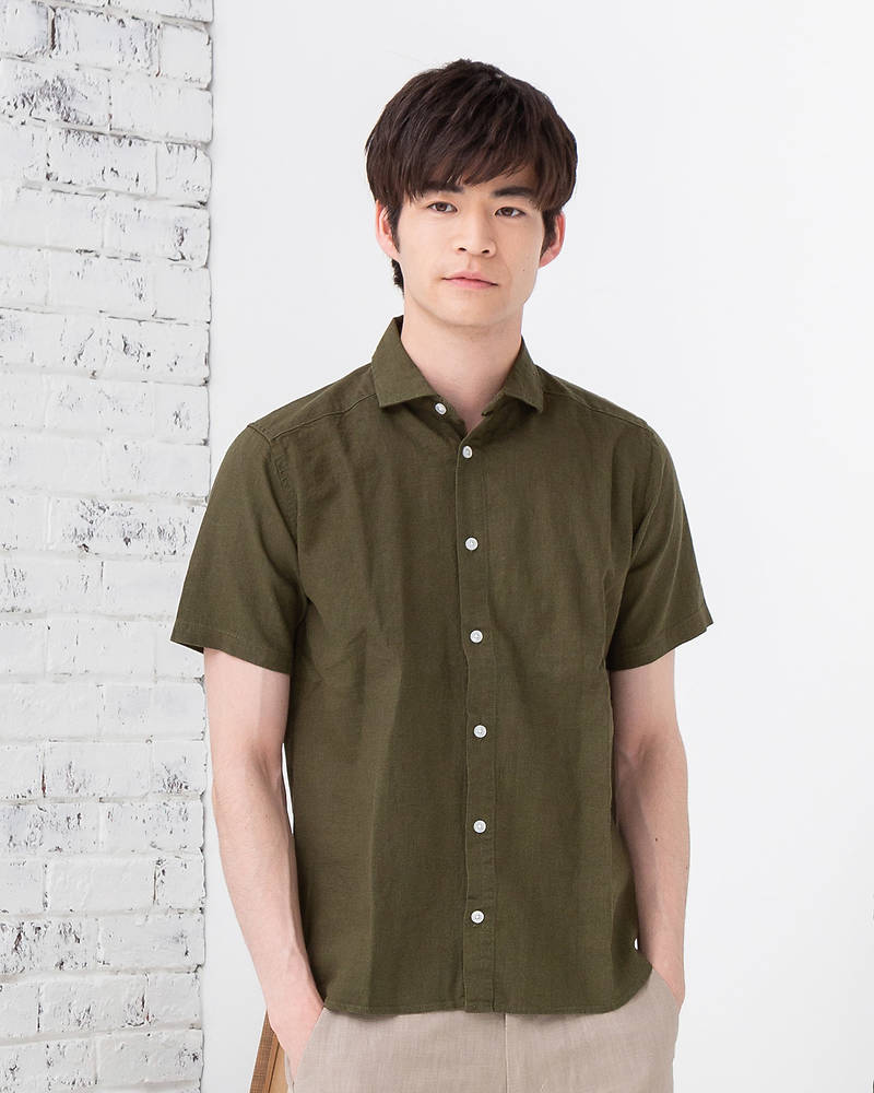 フレンチリネンレーヨン半袖シャツ(カーキ)