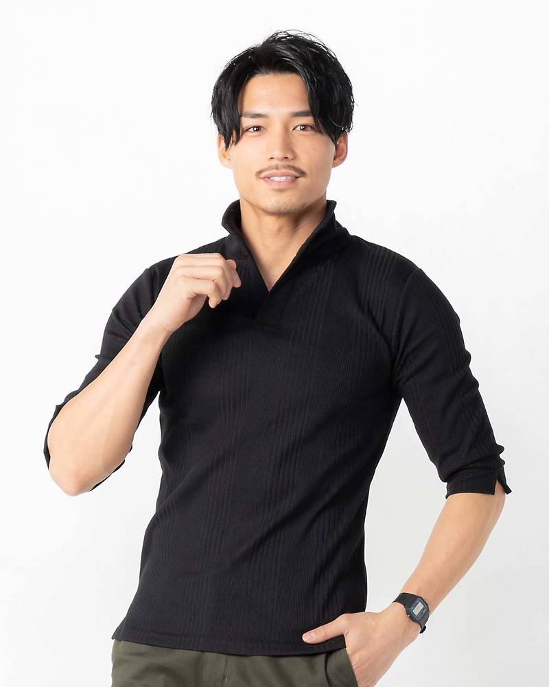 ランダムテレコ襟ワイヤー七分袖ポロシャツ(ブラック)