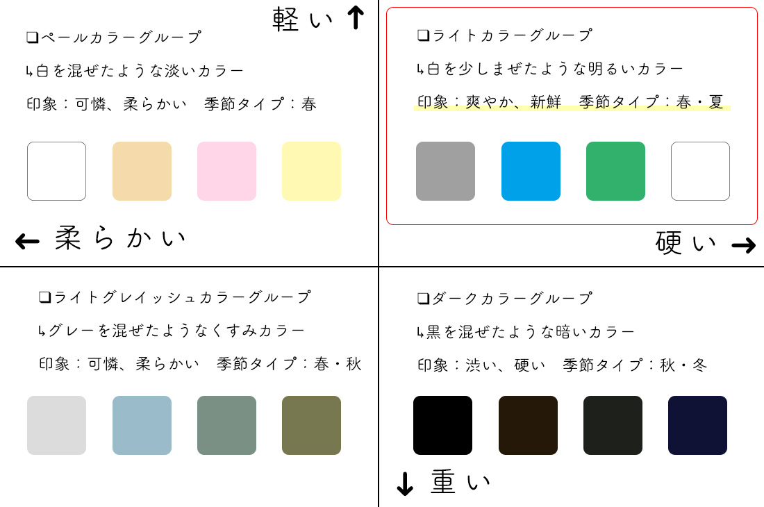 そこで、どんな色が爽やかに見えるのか、また色ごとにどんな印象効果があるのか。大きく4タイプに分けて下図のようにまとめてみました。
