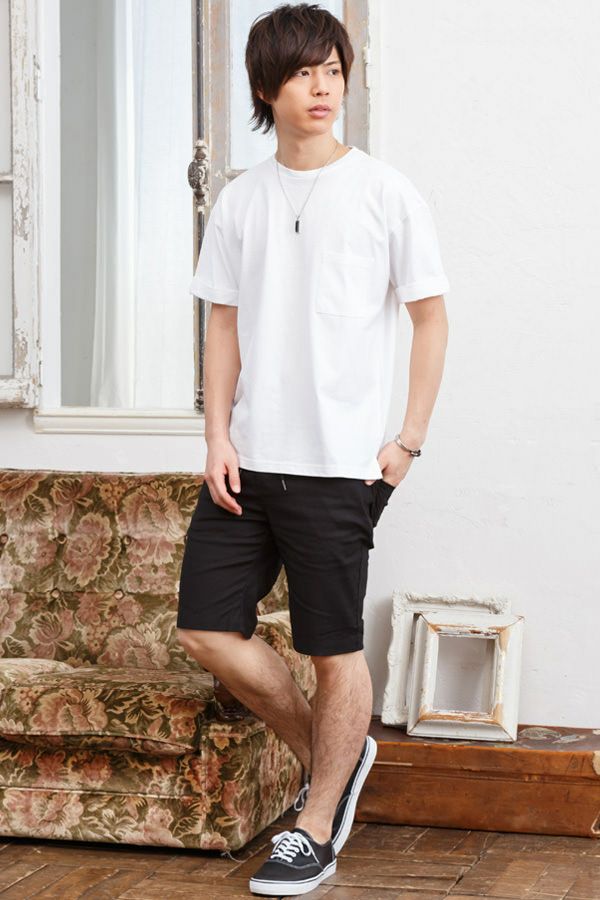 こちらは先のルーズTシャツにハーフパンツを合わせたコーディネートです。涼しげでアクティブな印象はリゾートに最適。足元はエスパドリーユやドライビングシューズ、サンダルなど軽やかなものにチェンジするとより一層リゾート感を演出できます。サングラスを合わせても。