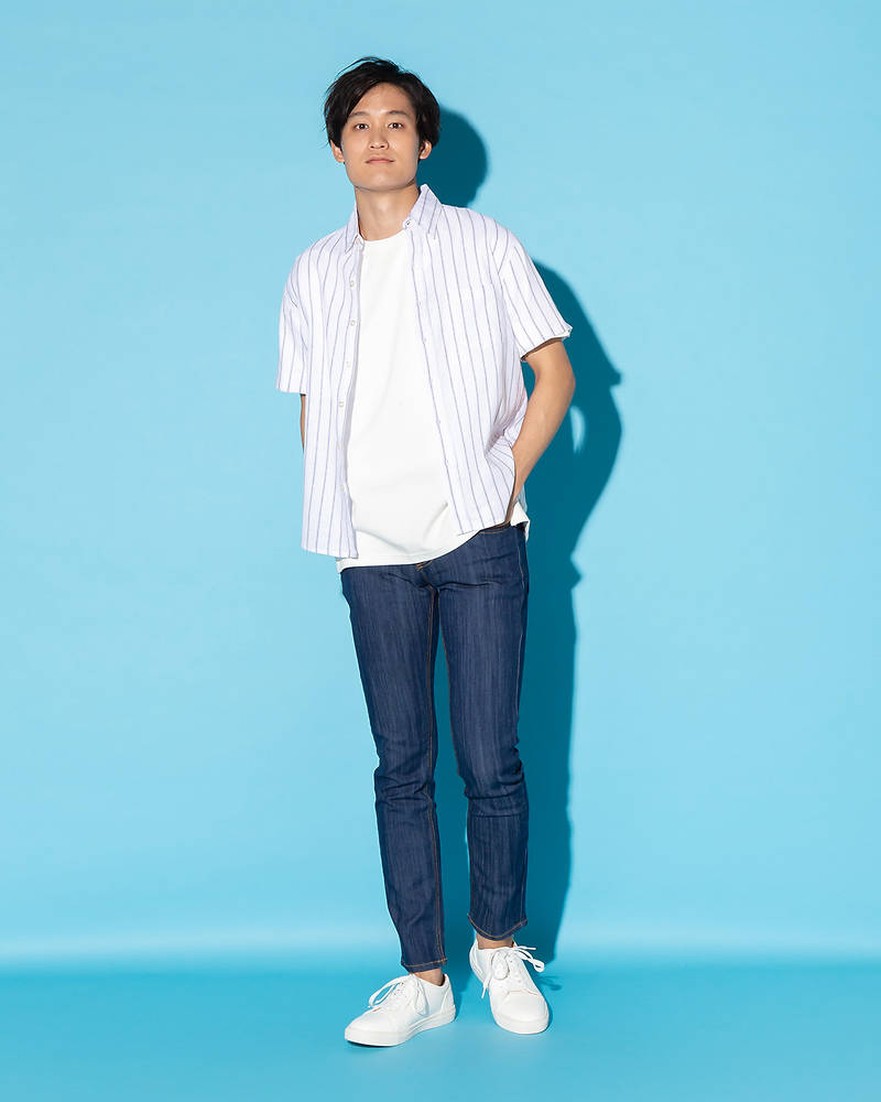 白地のストライプ柄シャツを1枚羽織るだけで海辺にも爽やかな合う夏スタイルが完成!
