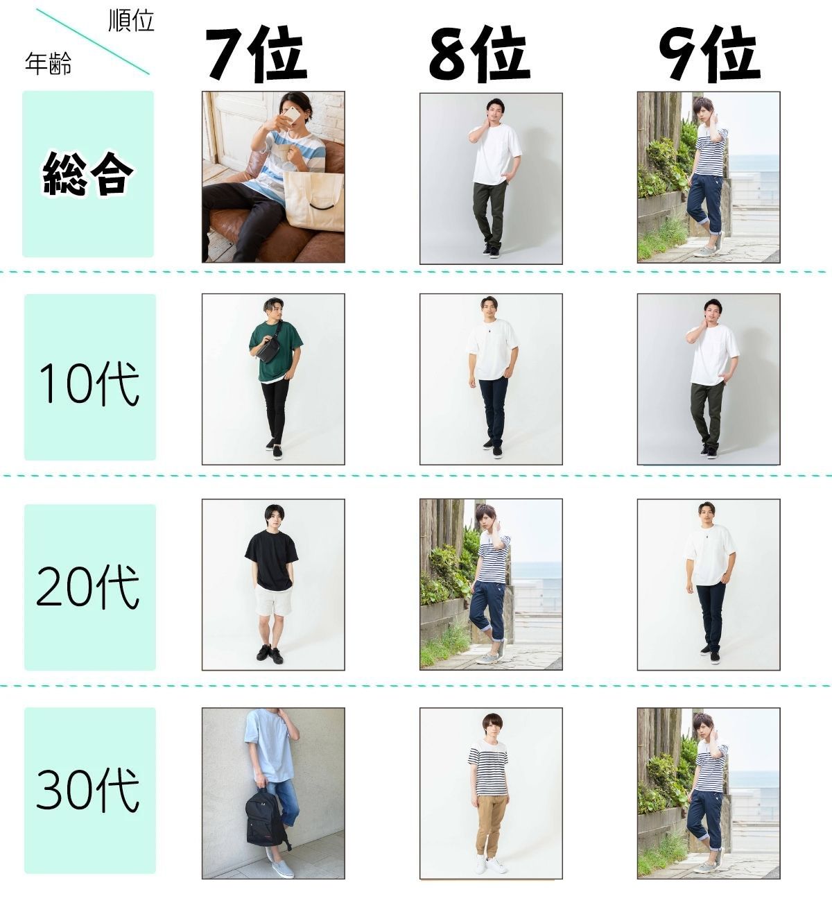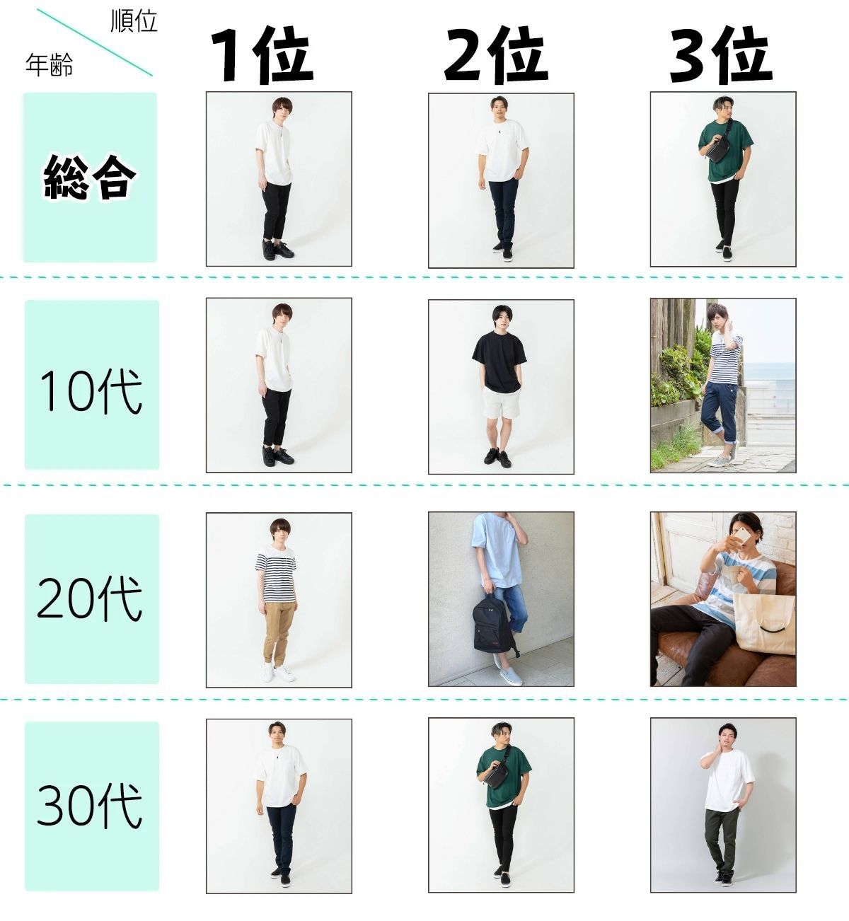 逆に20・30代男性向けで下位となったコーデは10代男性向けとして上位にランクインしています。