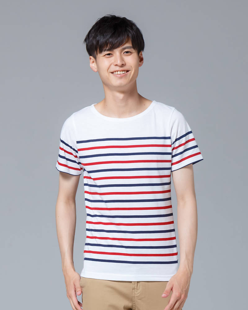 半袖パネルボーダーボートネックTシャツ(ネイビー×レッド)