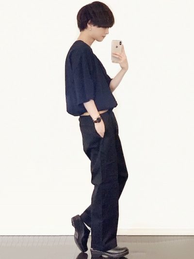 黒パン×黒革靴の合わせでシュッと大人っぽく決まっています。