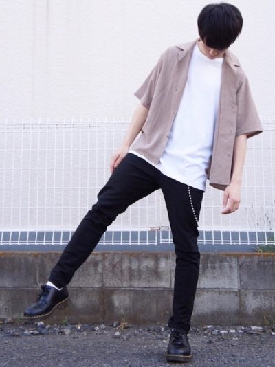 昨年から人気のオープンカラーシャツのコーデ。